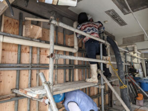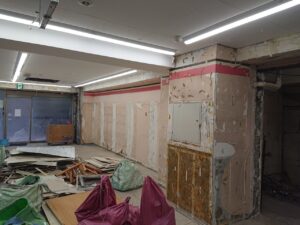 【内部】電気工事、壁・間仕切解体、クロス剥がし、吊下げ什器撤去、一部天井撤去、一部床Pタイル撤去、シール剥がし等